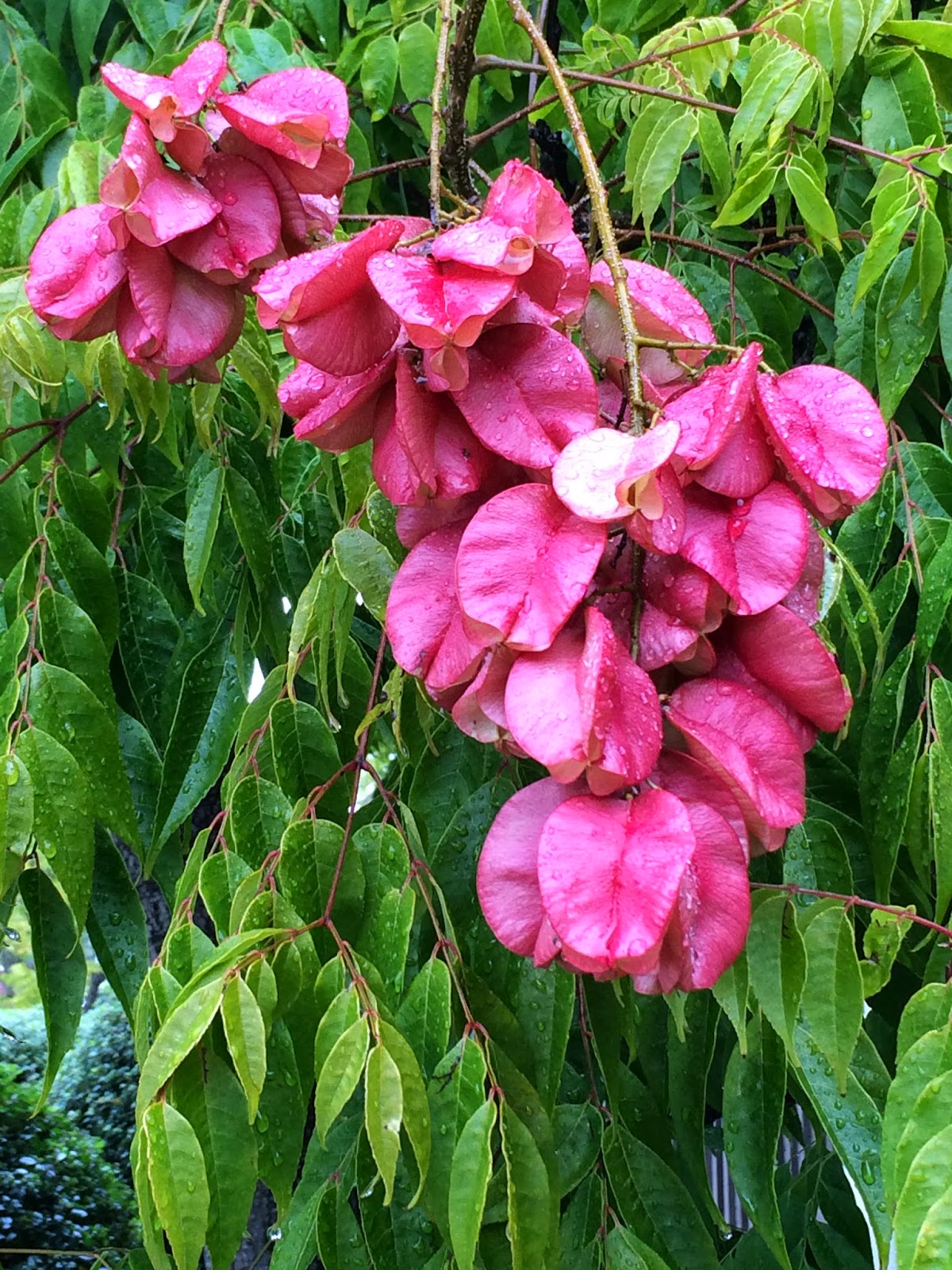 Fruit is pretty interesting. The seeds are enclosed in a papery seed coat looking like a Japanese lantern. The fruit start out green but develop into an attractive pink or red late fall. They eventually turn brown.