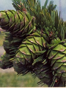 Female cones 3-8" long, yellowish green when mature, developing into a light brown color when open. White pine cones are quite different than yellow pine cones. White pines tend to be narrow, elongated, with scales that don't have a real distinct umbo, just a short darker area at the tip where a yellow pine has some sort of prickle usually.